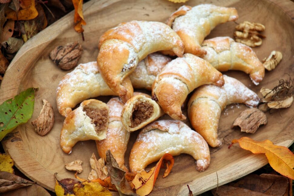 Odpočaté těsto zvážíme, rozdělíme na 5 dílů a každý vytvarujeme do koule. Těsto rozválíme dokulata na tloušťku zhruba 3 mm. Nožem vykrájíme trojúhelníky. Na každý trojúhelník dáme ořechovou náplň a kraje těsta potřeme bílkem. Rohy trojúhelníků a zadní okraj přehneme na náplň, srolujeme a vytvarujeme rohlíček. Okraje rohlíčku stiskneme mezi prsty, aby se těsto spojilo.