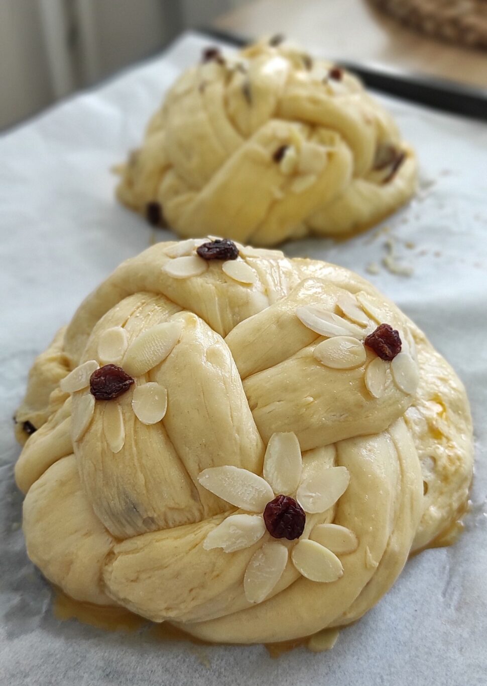 Bochánky přeneste na plech vyložený pečicím papírem a nechte dobře vykynout, objem musí být dvojnásobný. Vykynuté bochánky potřete rozšlehaným vajíčkem, posypejte mandlemi a nožem na povrchu vyřízněte kříž, aby měla kudy unikat pára a mazanec neprasknul.
