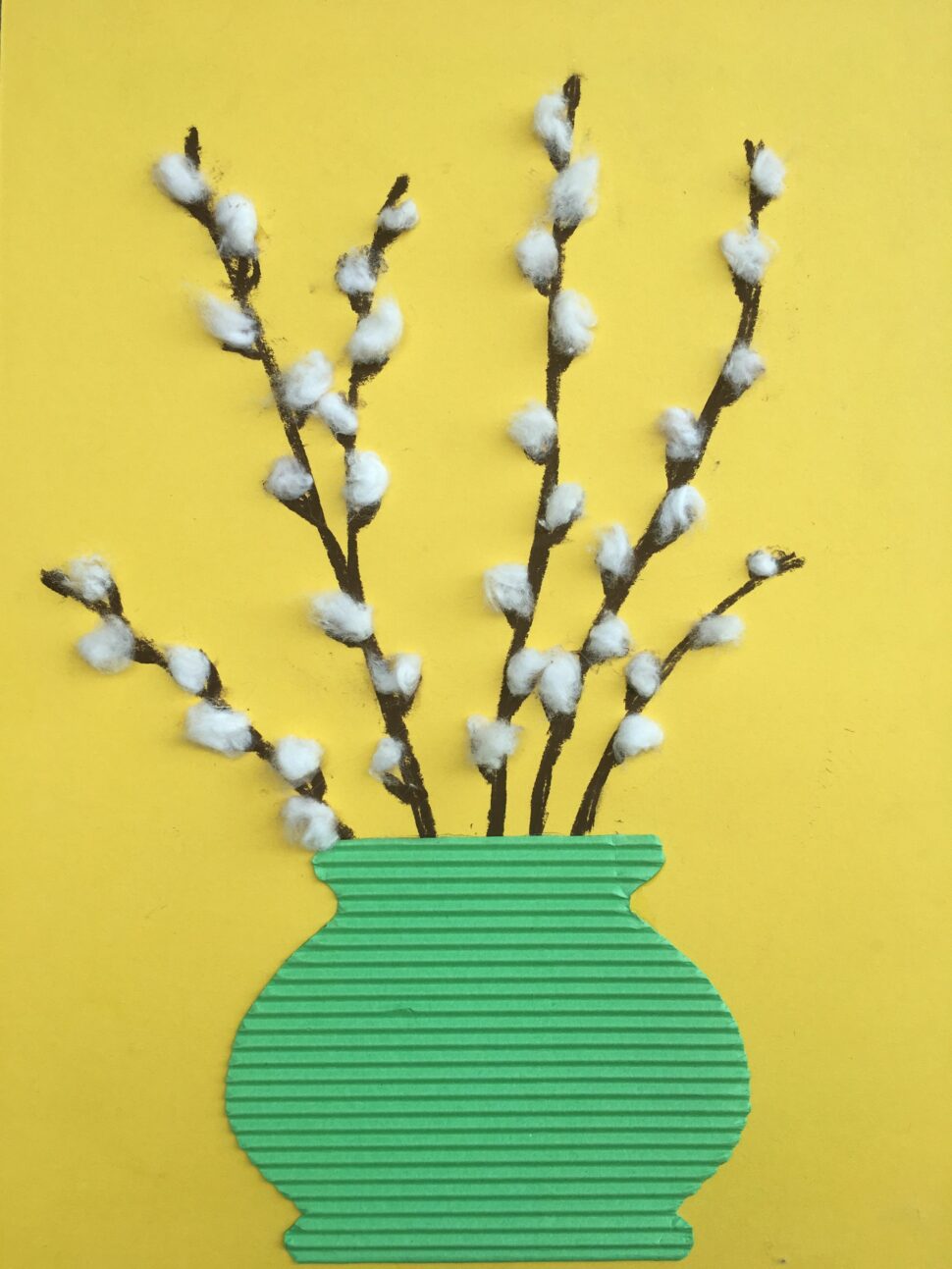 Z barevného papíru vystřihněte obrys vázy a nalepte ji na barevný podklad. Nad ni nalepte klacíky, které jste předtím nasbírali na procházce. Ty budou představovat větvičky ve váze. Na větvičky lepte malé kousky vaty místo kočiček. Nakonec můžete ještě dozdobit vázu fixami nebo barevnými papíry.