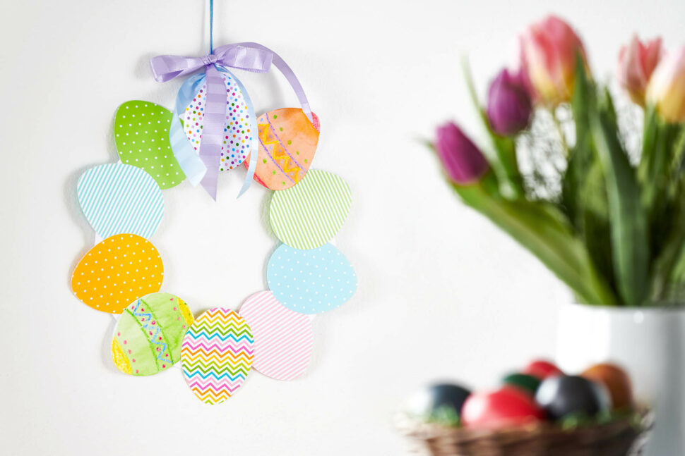 Na karton nebo starou krabici obkreslíme dva kruhy, jeden menší a jeden větší. Pokud nemáte kružítko, využít můžete cokoliv, třeba talíř. Kruh vystřihneme a vznikne podklad pro věnec. Určitě by stačil vystřihnout i ze čtvrtky, ale z kartonu bude lépe držet tvar, hlavně pokud bude věnec zavěšený. Poté dětem připravíme šablonu vajíček, klidně různě velké. Pomůžeme jim je překreslit na barevné papíry a těm mladším i vystřihnout. Pak už stačí jen nalepit vajíčka tak, jak se dětem bude nejvíce líbit. Vedle sebe, přes sebe, případně je děti mohou ještě dál dozdobit barvičkami. Nakonec věnec pomocí stužky zavěsíme.