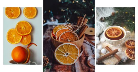 Nakrájejte pomeranče na tenké plátky, vysušte je v troubě na nízkém stupni (asi 80°C) po dobu 3-4 hodin. Hotové plátky propíchněte, protáhněte provázkem nebo stužkou a zavěste jako voňavé ozdoby.
